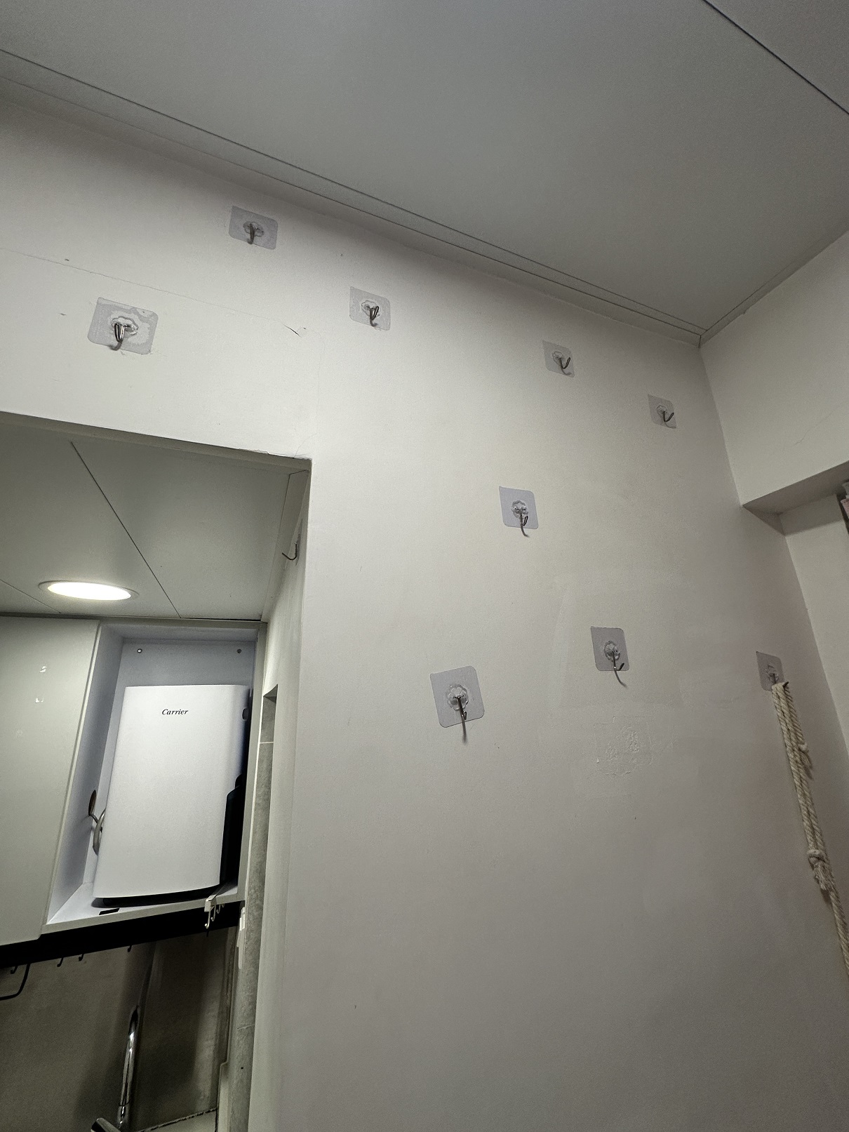 所以簡單來說,貼掛勾可以,但要用無痕的,在房間裡包括已貼的掛勾不要超過3個。
