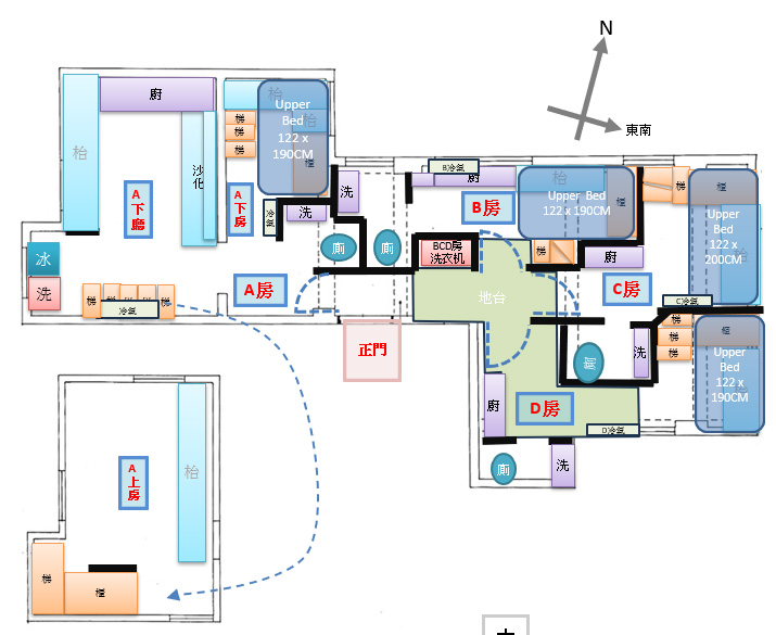 以上是整房平面图,一屋4房,各有獨立衛生間,A房自帶洗烘一体洗衣机,BCD房共用公區洗烘一体洗衣机。